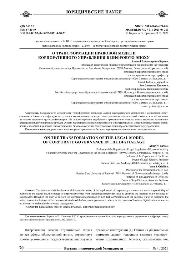 Барков А.В. О трансформации правовой модели корпоративного управления в цифровую эпоху / Барков А.В., Гришина Я.С. // Вестник экономической безопасности. – 2021. – № 4.- С.70-73. — Только в электронном виде. — <URL:http://elib.fa.ru/art2021/bv3491.pdf>.