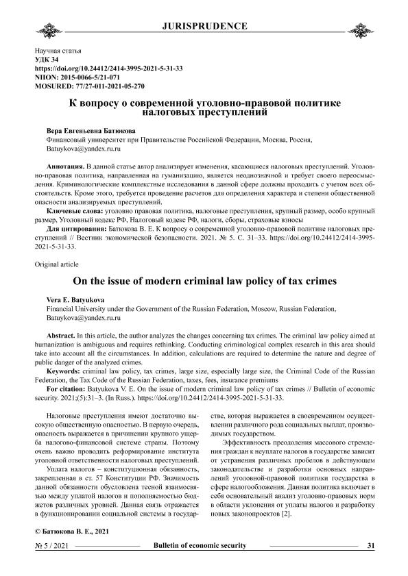 Батюкова В.Е. К вопросу о современной уголовно-правовой политике налоговых преступлений // Вестник экономической безопасности. – 2021. – № 5.- С.31-33. — Только в электронном виде. — <URL:http://elib.fa.ru/art2021/bv3492.pdf>.