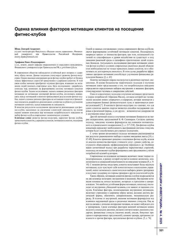 Шпак, Д.А. Оценка влияния факторов мотивации клиентов на посещение фитнес-клубов / Д.А. Шпак, П.В. Трифонов // Инновации и инвестиции. – 2025. – № 4. — С. 321-324. — Только в электронном виде. — <URL:http://elib.fa.ru/art2025/bv1700.pdf>.