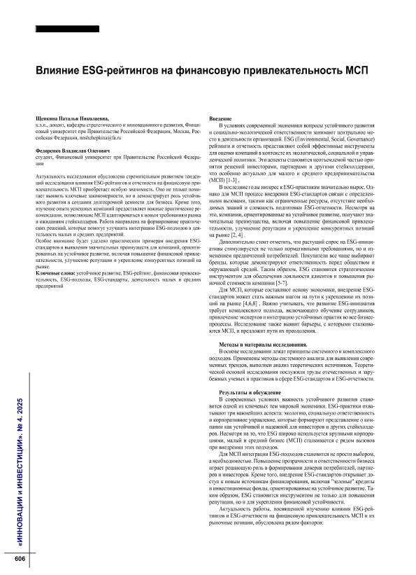 Щепкина, Н.Н. Влияние ESG-рейтингов на финансовую привлекательность МСП / Н.Н. Щепкина, В.О. Федоренко // Инновации и инвестиции. – 2025. – № 4. — С. 606-610. — Только в электронном виде. — <URL:http://elib.fa.ru/art2025/bv1701.pdf>.