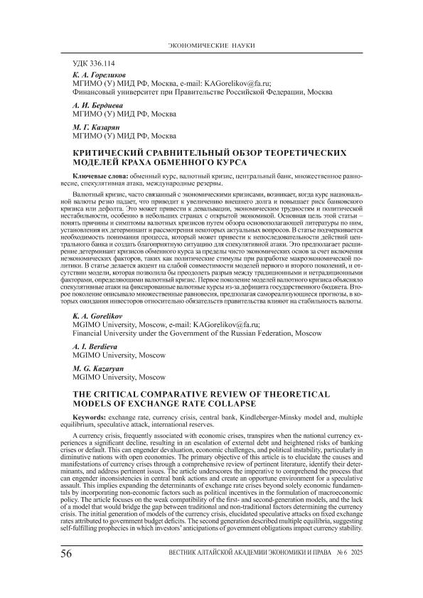 Гореликов, К.А. Критический сравнительный обзор теоретических моделей краха обменного курса / К.А. Гореликов, А.И. Бердиева, М.Г. Казарян // Вестник Алтайской академии экономики и права. – 2025. – № 6. — С. 56-62. — Только в электронном виде. — <URL:http://elib.fa.ru/art2025/bv585.pdf>.