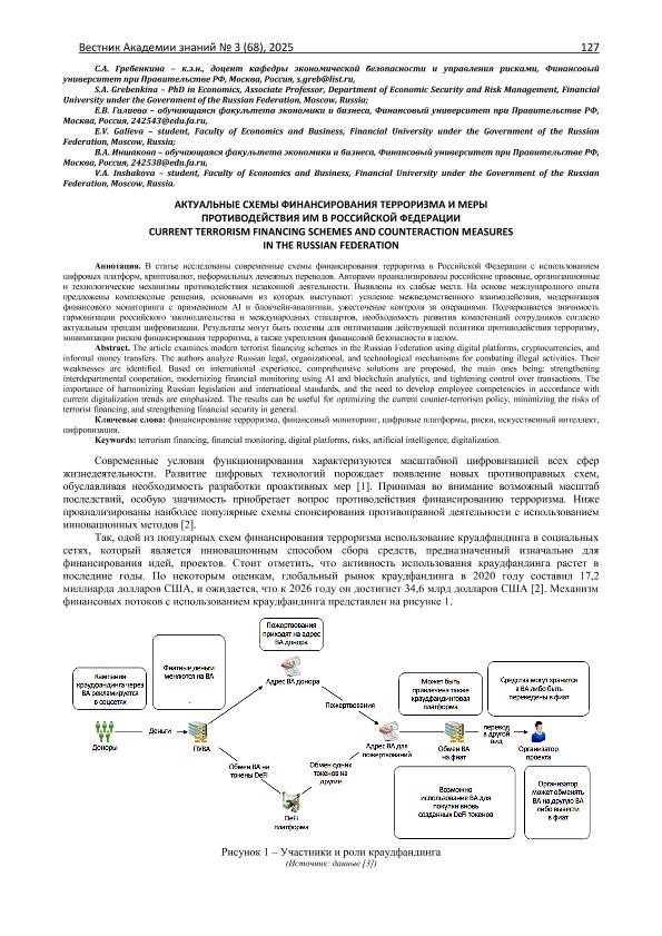 Гребенкина, С.А. Актуальные схемы финансирования терроризма и меры противодействия им в Российской Федерации / С.А. Гребенкина, Е.В. Галиева, В.А. Иншакова // Вестник Академии знаний. – 2025. – № 3. — С. 127-131. — Только в электронном виде. — <URL:http://elib.fa.ru/art2025/bv586.pdf>.