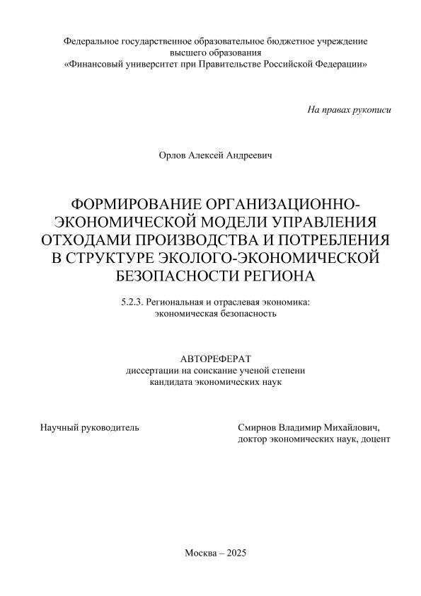 Орлов, Алексей Андреевич. Формирование организационно-экономической модели управления отходами производства и потребления в структуре эколого-экономической безопасности региона: автореферат дис. ... кандидата экономических наук ; спец. 5.2.3, защищена 09.12.2025 / А.А. Орлов; Место защиты: Финуниверситет, Работа выполнена: Финуниверситет; Департамент экономической безопасности. — Москва, 2025. — 26 с. — Доступ из локальной сети Финуниверситета (чтение). — <URL:http://elib.fa.ru/avtoreferat/Orlov2025.pdf>.