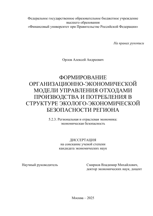 Орлов, Алексей Андреевич. Формирование организационно-экономической модели управления отходами производства и потребления в структуре эколого-экономической безопасности региона: дис. ... кандидата экономических наук ; спец. 5.2.3, защищена 09.12.2025 / А.А. Орлов; Место защиты: Финуниверситет, Работа выполнена: Финуниверситет; Департамент экономической безопасности. — Москва, 2025. — 195 с. — Доступ из локальной сети Финуниверситета (чтение). — <URL:http://elib.fa.ru/avtoreferat/Orlov2025_diss.pdf>.
