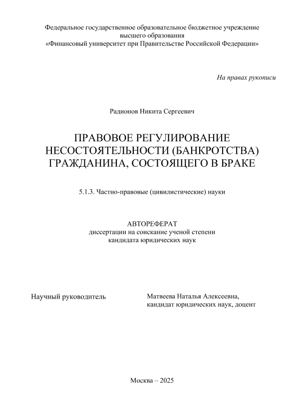 Радионов, Никита Сергеевич. Правовое регулирование несостоятельности (банкротства) гражданина, состоящего в браке: автореферат дис. ... кандидата юридических наук ; спец. 5.1.3, защищена 11.12.2025 / Н.С. Радионов; Место защиты: Финуниверситет, Работа выполнена: Финуниверситет; Департамент правового регулирования экономической деятельности. — Москва, 2025. — 24 с. — Доступ из локальной сети Финуниверситета (чтение). — <URL:http://elib.fa.ru/avtoreferat/Radionov.pdf>.