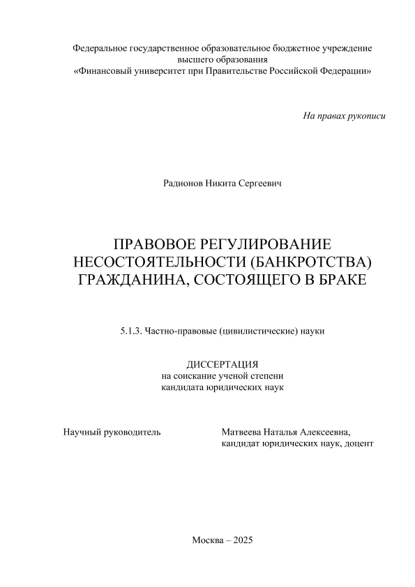 Радионов, Никита Сергеевич. Правовое регулирование несостоятельности (банкротства) гражданина, состоящего в браке: дис. ... кандидата юридических наук ; спец. 5.1.3, защищена 11.12.2025 / Н.С. Радионов; Место защиты: Финуниверситет, Работа выполнена: Финуниверситет; Департамент правового регулирования экономической деятельности. — Москва, 2025. — 270 с. — Доступ из локальной сети Финуниверситета (чтение). — <URL:http://elib.fa.ru/avtoreferat/Radionov_diss.pdf>.
