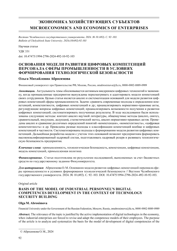 Абросимова, О.М. Основания модели развития цифровых компетенций персонала сферы промышленности в условиях формирования технологической безопасности // Вестник Челябинского государственного университета. – 2024. – № 10. — С. 92-103. — Только в электронном виде. — <URL:http://elib.fa.ru/art2024/bv3731.pdf>.