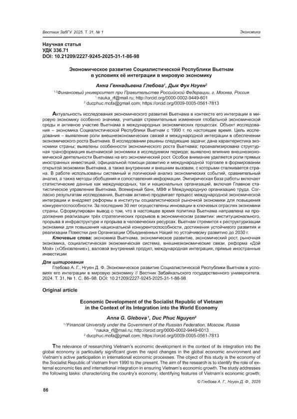 Глебова, А.Г. Экономическое развитие Социалистической Республики Вьетнам в условиях её интеграции в мировую экономику / А.Г. Глебова, Д.Ф. Нгуен // Вестник Забайкальского государственного университета. – 2024. – № 1. — С. 86-98. — Только в электронном виде. — <URL:http://elib.fa.ru/art2024/bv3738.pdf>.