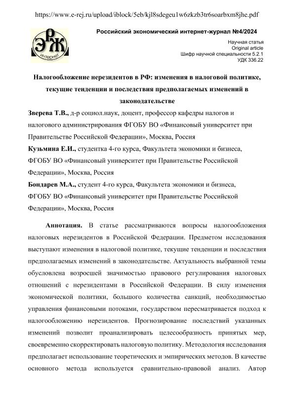 Зверева, Т.В. Налогообложение нерезидентов в РФ: изменения в налоговой политике, текущие тенденции и последствия предполагаемых изменений в законодательстве / Т.В. Зверева, Е.И. Кузьмина, М.А. Бондарев. — Текст: электронный // Российский экономический интернет-журнал. – 2024. – № 4. - URL: https://www.e-rej.ru/upload/iblock/5eb/kjl8sdegeu1w6zkzb3tr6soarbxm8jhe.pdf (дата обращения: 01.09.2025) — <URL:http://elib.fa.ru/art2024/bv3891.pdf>.