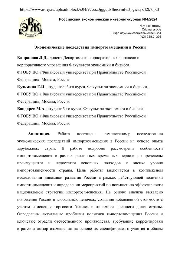 Капранова, Л.Д. Экономические последствия импортозамещения в России / Л.Д. Капранова, Е.И. Кузьмина, М.А. Бондарев. — Текст: электронный // Российский экономический интернет-журнал. – 2024. – № 4. - URL: https://www.e-rej.ru/upload/iblock/c04/97ooz3jggqtb4hesvmlw3pgiczyx42k7.pdf (дата обращения: 01.09.2025) — <URL:http://elib.fa.ru/art2024/bv3893.pdf>.