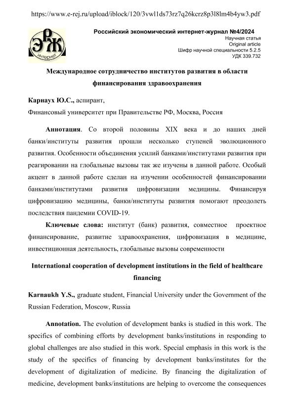 Карнаух, Ю.С. Международное сотрудничество институтов развития в области финансирования здравоохранения. — Текст: электронный // Российский экономический интернет-журнал. – 2024. – № 4. - URL: https://www.e-rej.ru/upload/iblock/120/3vwl1ds73rz7q26kcrz8p3l8lm4b4yw3.pdf (дата обращения: 01.09.2025) — <URL:http://elib.fa.ru/art2024/bv3894.pdf>.