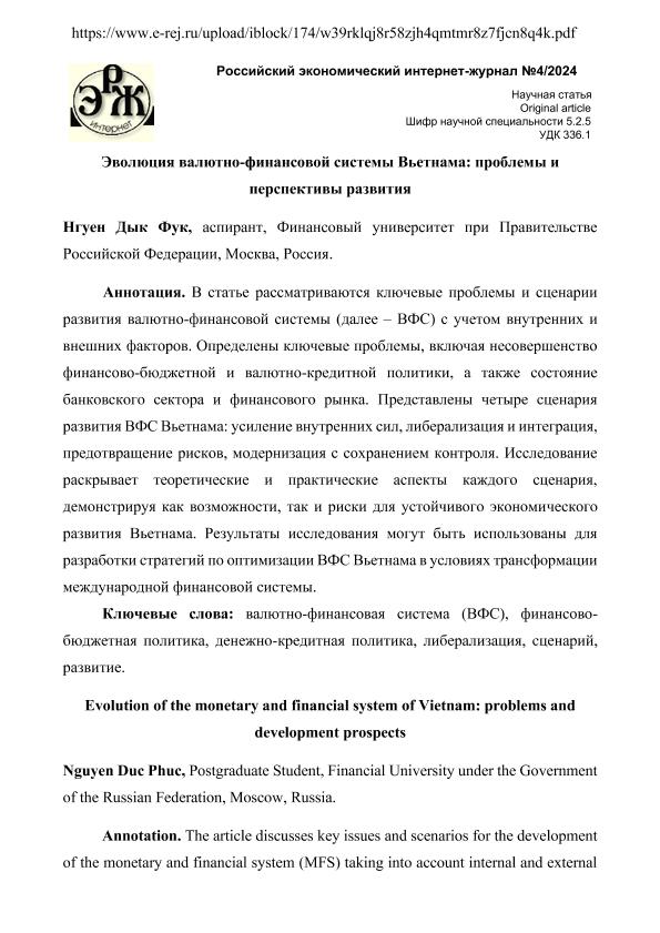 Нгуен Дык Фук. Эволюция валютно-финансовой системы Вьетнама: проблемы и перспективы развития. — Текст: электронный // Российский экономический интернет-журнал. – 2024. – № 4. - URL: https://www.e-rej.ru/upload/iblock/174/w39rklqj8r58zjh4qmtmr8z7fjcn8q4k.pdf (дата обращения: 01.09.2025) — <URL:http://elib.fa.ru/art2024/bv3906.pdf>.