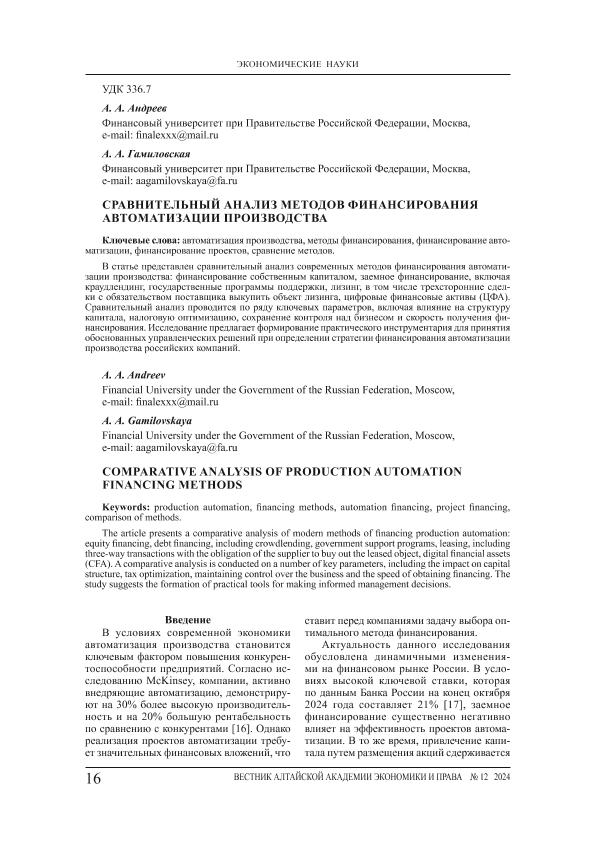 Андреев, А.А. Сравнительный анализ методов финансирования автоматизации производства / А.А. Андреев, А.А. Гамиловская // Вестник Алтайской академии экономики и права. – 2024. – № 12-1. — С. 16-24. — Только в электронном виде. — <URL:http://elib.fa.ru/art2024/bv3918.pdf>.