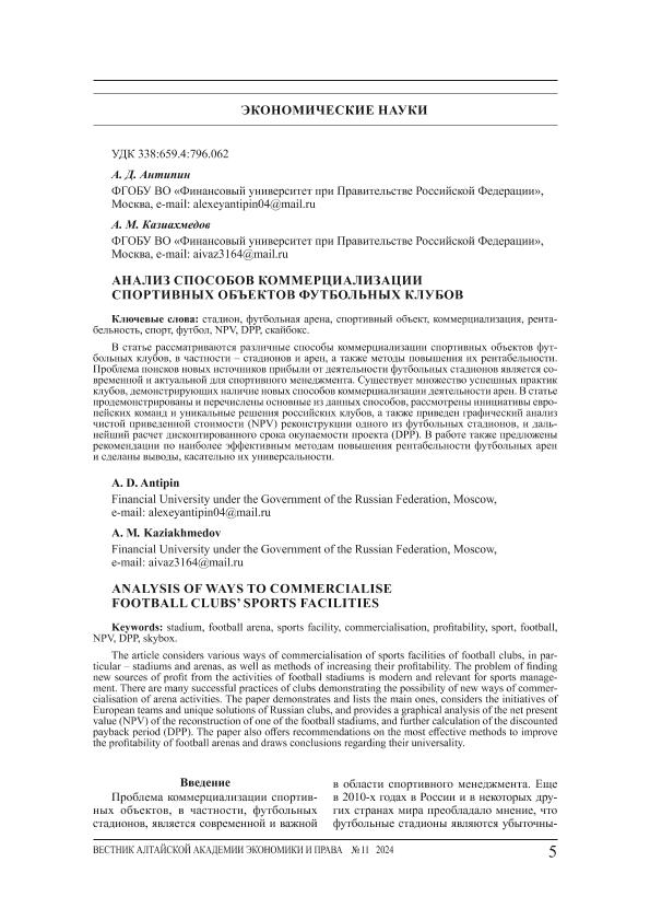 Антипин, А.Д. Анализ способов коммерциализации спортивных объектов футбольных клубов / А.Д. Антипин, А.М. Казиахмедов // Вестник Алтайской академии экономики и права. – 2024. – № 11-1. — С. 5-10. — Только в электронном виде. — <URL:http://elib.fa.ru/art2024/bv3919.pdf>.