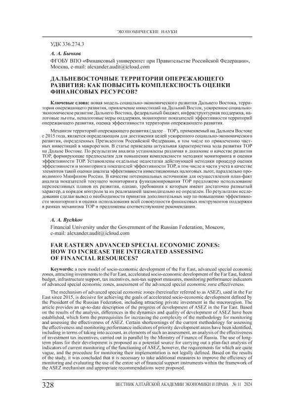 Бычков, А.А. Дальневосточные территории опережающего развития: как повысить комплексность оценки финансовых ресурсов? // Вестник Алтайской академии экономики и права. – 2024. – № 11-3. — С. 328-338. — Только в электронном виде. — <URL:http://elib.fa.ru/art2024/bv3929.pdf>.