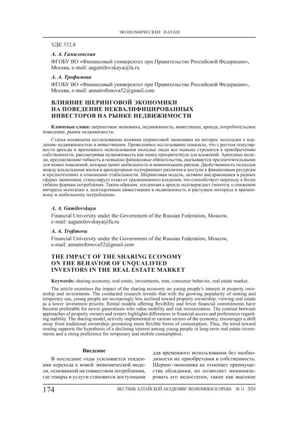 Гамиловская, А.А. Влияние шеринговой экономики на поведение неквалифицированных инвесторов на рынке недвижимости / А.А. Гамиловская, А.А. Трофимова // Вестник Алтайской академии экономики и права. – 2024. – № 11-2. — С. 174-181. — Только в электронном виде. — <URL:http://elib.fa.ru/art2024/bv3932.pdf>.