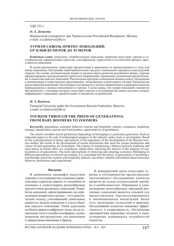 Денисова, О.А. Туризм сквозь призму поколений: от бэби-бумеров до зумеров // Вестник Алтайской академии экономики и права. – 2024. – № 11-2. — С. 187-191. — Только в электронном виде. — <URL:http://elib.fa.ru/art2024/bv3935.pdf>.