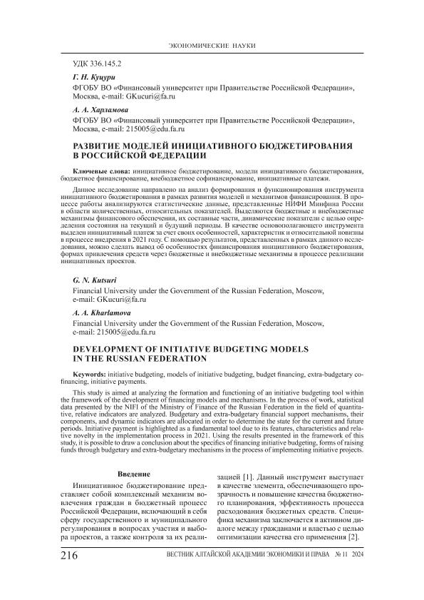 Куцури, Г.Н. Развитие моделей инициативного бюджетирования в Российской Федерации / Г.Н. Куцури, А.А. Харламова // Вестник Алтайской академии экономики и права. – 2024. – № 11-2. — С. 216-221. — Только в электронном виде. — <URL:http://elib.fa.ru/art2024/bv3951.pdf>.