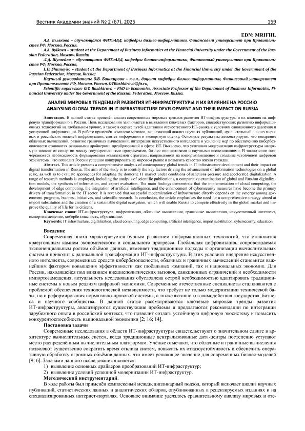 Былкова, А.А. Анализ мировых тенденций развития ИТ-инфраструктуры и их влияние на Россию / А.А. Былкова, Л.Д. Шумейко // Вестник Академии знаний. – 2025. – № 2. — С. 159-161. — Только в электронном виде. — <URL:http://elib.fa.ru/art2025/bv535.pdf>.