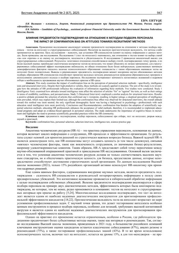 Валишин, Е.Н. Влияние предвзятости подтверждения на отношение к методам подбора персонала // Вестник Академии знаний. – 2025. – № 2. — С. 947-953. — Только в электронном виде. — <URL:http://elib.fa.ru/art2025/bv536.pdf>.