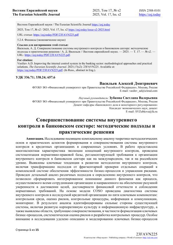 Васильев, А.Д. Совершенствование системы внутреннего контроля в банковском секторе: методические подходы и