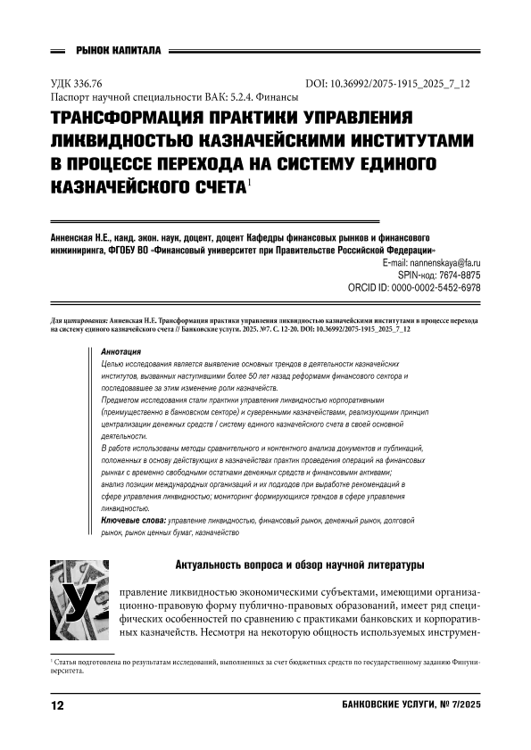 Анненская, Н.Е. Трансформация практики управления ликвидностью казначейскими институтами в процессе перехода на систему единого казначейского счета // Банковские услуги. – 2025. – № 7. — С. 12-20. — Только в электронном виде. — <URL:http://elib.fa.ru/art2025/bv539.pdf>.