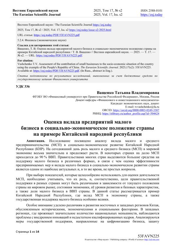Ващенко, Т.В. Оценка вклада предприятий малого бизнеса в социально-экономическое положение страны на примере Китайской народной республики. — Текст: электронный // Вестник Евразийской науки. – 2025. – № s2. — URL: https://esj.today/PDF/53FAVN225.pdf (дата обращения: 23.10.2025) — <URL:http://elib.fa.ru/art2025/bv540.pdf>.