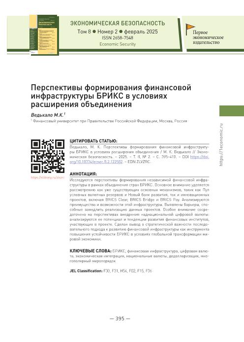 Ведькало, М.К. Перспективы формирования финансовой инфраструктуры БРИКС в условиях расширения объединения // Экономическая безопасность. – 2025. – № 2. — С. 395-410. — Только в электронном виде. — <URL:http://elib.fa.ru/art2025/bv541.pdf>.