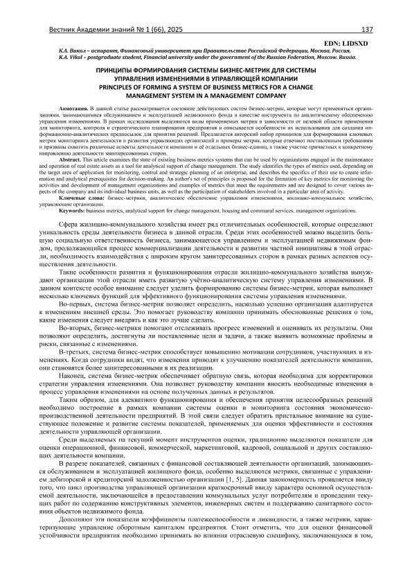 Викол, К.А. Принципы формирования системы бизнес-метрик для системы управления изменениями в управляющей компании // Вестник Академии знаний. – 2025. – № 1. — С. 137-139. — Только в электронном виде. — <URL:http://elib.fa.ru/art2025/bv542.pdf>.