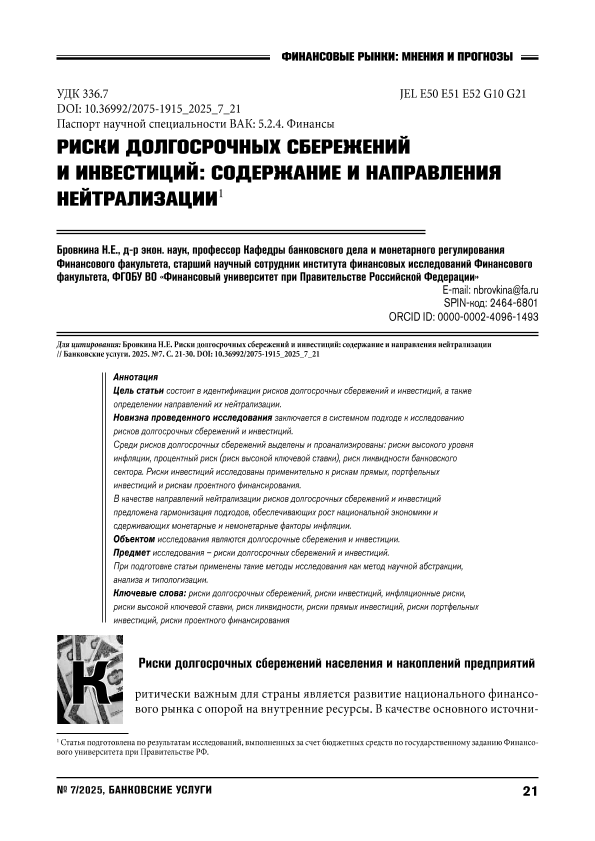 Бровкина, Н.Е. Риски долгосрочных сбережений и инвестиций: содержание и направления нейтрализации // Банковские услуги. – 2025. – № 7. — С. 21-30. — Только в электронном виде. — <URL:http://elib.fa.ru/art2025/bv543.pdf>.