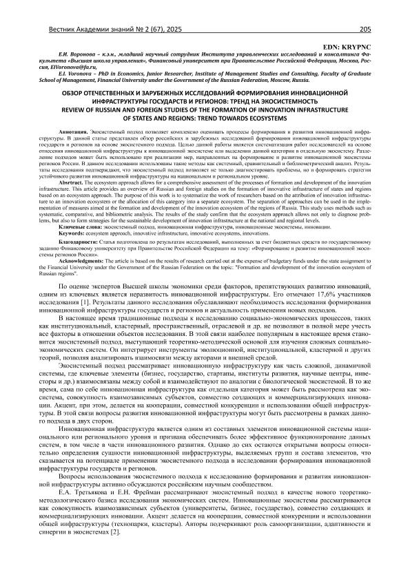 Воронова, Е.И. Обзор отечественных и зарубежных исследований формирования инновационной инфраструктуры государств и регионов: тренд на экосистемность // Вестник Академии знаний. – 2025. – № 2. — С. 205-207. — Только в электронном виде. — <URL:http://elib.fa.ru/art2025/bv544.pdf>.