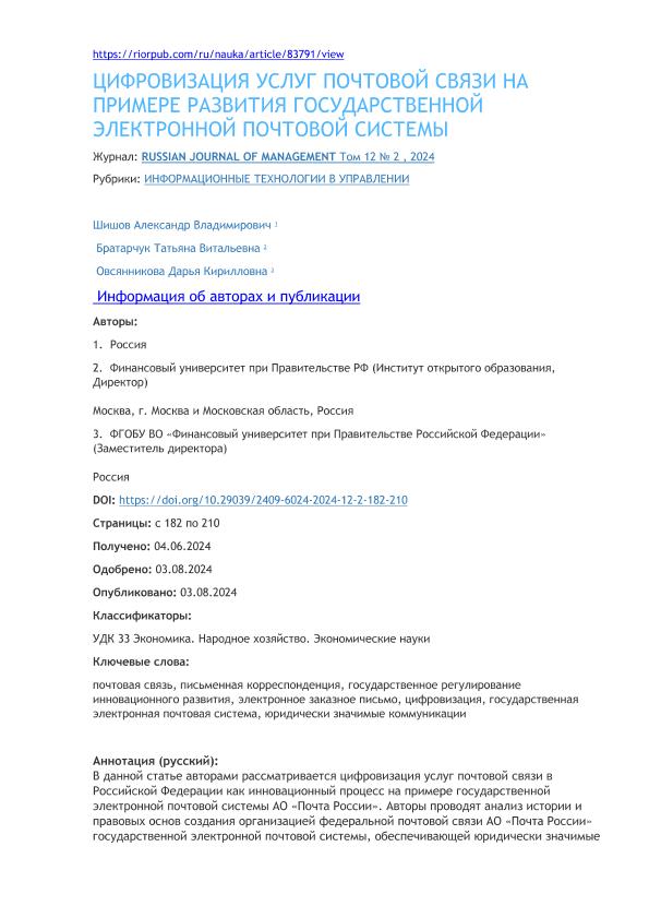 Шишов, А.В. Цифровизация услуг почтовой связи на примере развития государственной электронной почтовой системы / А.В. Шишов, Т.В. Братарчук, Д.К. Овсянникова. — Текст: электронный // Russian Journal of Management. – 2024. – № 2. — С. 182-210. - URL: https://riorpub.com/ru/nauka/article/83791/view. - Дата публикации: 03.08.2024 — <URL:http://elib.fa.ru/art2024/bv3233.pdf>.