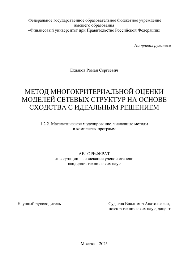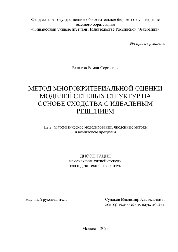Ехлаков, Роман Сергеевич. Метод многокритериальной оценки моделей сетевых структур на основе сходства с идеальным решением: дис. ... кандидата технических наук ; спец. 1.2.2, защищена 09.09.2025 / Р.С. Ехлаков; Место защиты: Финуниверситет, Работа выполнена: Финуниверситет; Кафедра анализа данных и машинного обучения. — Москва, 2025. — 237 с. — Свободный доступ из сети Интернет (чтение). — <URL:http://elib.fa.ru/avtoreferat/Ekhlakov_diss.pdf>.