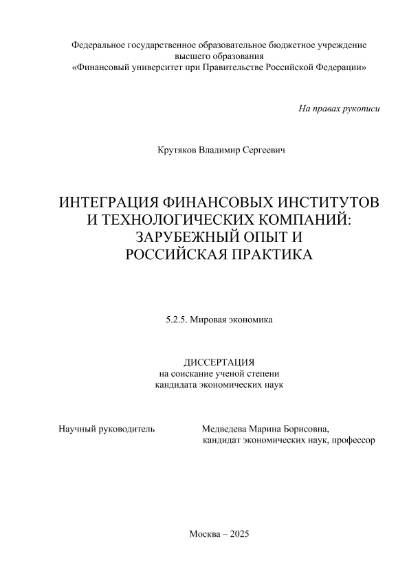 Крутяков, Владимир Сергеевич. Интеграция финансовых институтов и технологических компаний: зарубежный опыт и российская практика: дис. ... кандидата экономических наук ; спец. 5.2.5, защищена 05.09.2025 / В.С. Крутяков; Место защиты: Финуниверситет, Работа выполнена: Финуниверситет; Кафедра мировой экономики и мировых финансов. — Москва, 2025. — 239 с. — Доступ по паролю из сети Интернет (чтение). — <URL:http://elib.fa.ru/avtoreferat/Krutyakov_diss.pdf>.