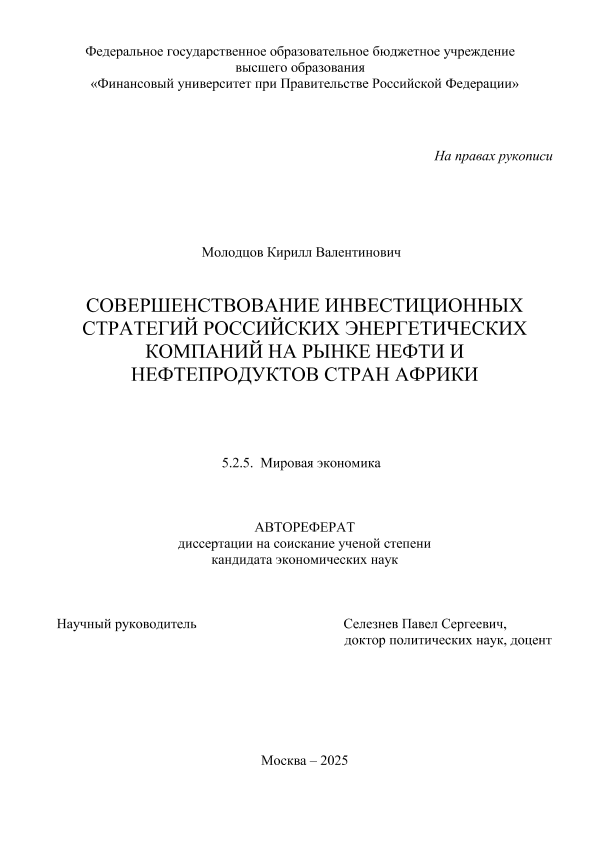 Молодцов, Кирилл Валентинович. Совершенствование инвестиционных стратегий российских энергетических компаний на рынке нефти и нефтепродуктов стран Африки: автореферат дис. ... кандидата экономических наук ; спец. 5.2.5, защищена 03.09.2025 / К.В. Молодцов; Место защиты: Финуниверситет, Работа выполнена: Финуниверситет; Кафедра мировой экономики и мировых финансов. — Москва, 2025. — 24 с. — Доступ из локальной сети Финуниверситета (чтение). — <URL:http://elib.fa.ru/avtoreferat/Molodtsov.pdf>.