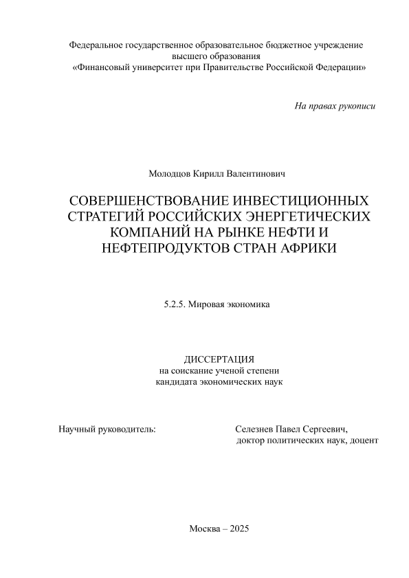 Молодцов, Кирилл Валентинович. Совершенствование инвестиционных стратегий российских энергетических компаний на рынке нефти и нефтепродуктов стран Африки: дис. ... кандидата экономических наук ; спец. 5.2.5, защищена 03.09.2025 / К.В. Молодцов; Место защиты: Финуниверситет, Работа выполнена: Финуниверситет; Кафедра мировой экономики и мировых финансов. — Москва, 2025. — 208 с. — Доступ из локальной сети Финуниверситета (чтение). — <URL:http://elib.fa.ru/avtoreferat/Molodtsov_diss.pdf>.