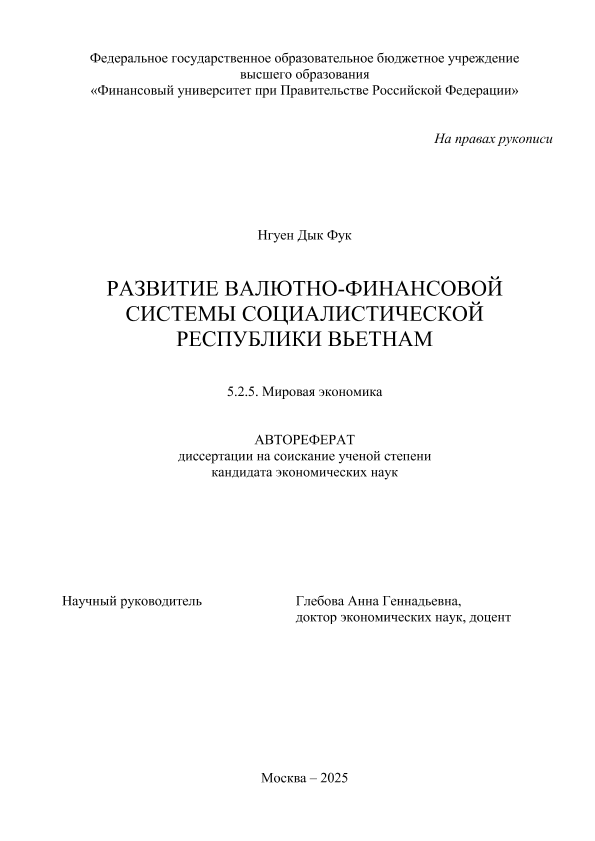 Нгуен, Дык Фук. Развитие валютно-финансовой системы Социалистической Республики Вьетнам: автореферат дис. ... кандидата экономических наук ; спец. 5.2.5, защищена 03.09.2025 / Д.Ф. Нгуен; Место защиты: Финуниверситет, Работа выполнена: Финуниверситет; Кафедра мировой экономики и мировых финансов. — Москва, 2025. — 25 с. — Доступ из локальной сети Финуниверситета (чтение). — <URL:http://elib.fa.ru/avtoreferat/Nguen_DF.pdf>.