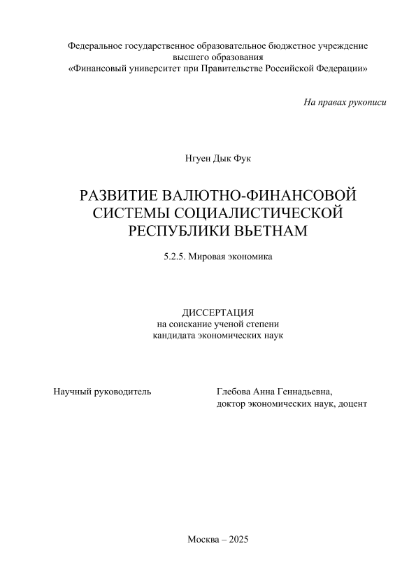 Нгуен, Дык Фук. Развитие валютно-финансовой системы Социалистической Республики Вьетнам: дис. ... кандидата экономических наук ; спец. 5.2.5, защищена 03.09.2025 / Д.Ф. Нгуен; Место защиты: Финуниверситет, Работа выполнена: Финуниверситет; Кафедра мировой экономики и мировых финансов. — Москва, 2025. — 215 с. — Доступ из локальной сети Финуниверситета (чтение). — <URL:http://elib.fa.ru/avtoreferat/Nguen_DF_diss.pdf>.