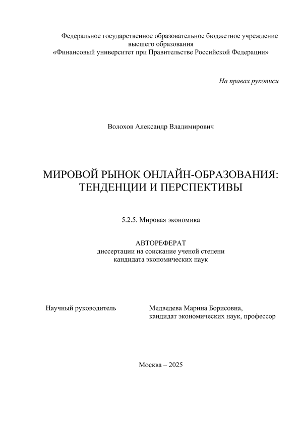 Волохов, Александр Владимирович. Мировой рынок онлайн-образования: тенденции и перспективы: авторефрат дис. ... кандидата экономических наук ; спец. 5.2.5, защищена 05.09.2025 / А.В. Волохов; Место защиты: Финуниверситет, Работа выполнена: Финуниверситет; Кафедра мировой экономики и мировых финансов. — Москва, 2025. — 26 с. — Доступ по паролю из сети Интернет (чтение). — <URL:http://elib.fa.ru/avtoreferat/Volokhov.pdf>.