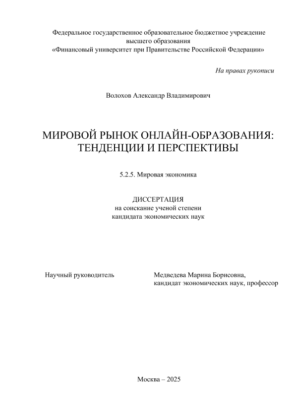 Волохов, Александр Владимирович. Мировой рынок онлайн-образования: тенденции и перспективы: дис. ... кандидата экономических наук ; спец. 5.2.5, защищена 05.09.2025 / А.В. Волохов; Место защиты: Финуниверситет, Работа выполнена: Финуниверситет; Кафедра мировой экономики и мировых финансов. — Москва, 2025. — 221 с. — Доступ по паролю из сети Интернет (чтение). — <URL:http://elib.fa.ru/avtoreferat/Volokhov_diss.pdf>.