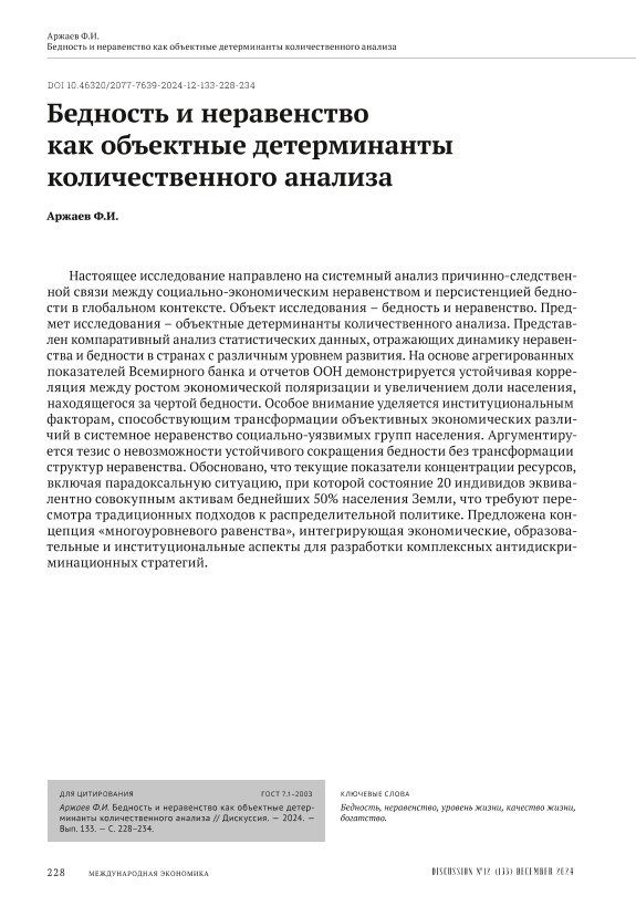Аржаев, Ф.И. Бедность и неравенство как объектные детерминанты количественного анализа // Дискуссия. – 2024. – № 133. — С. 228-234 — <URL:http://elib.fa.ru/art2024/bv3585.pdf>.