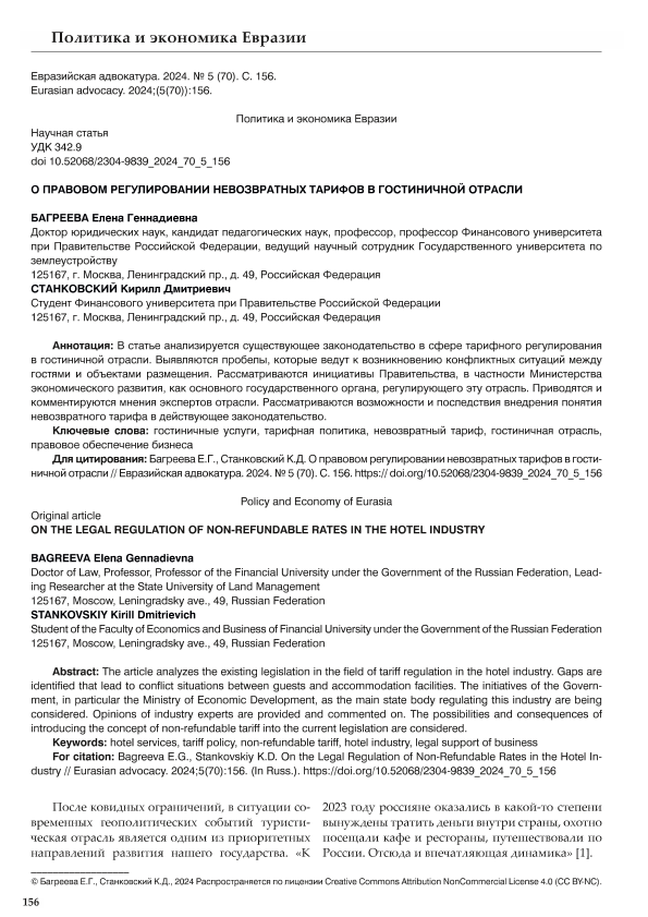 Багреева, Е.Г. О правовом регулировании невозвратных тарифов в гостиничной отрасли / Е.Г. Багреева, К.Д. Станковский // Евразийская адвокатура. – 2024. – № 5. — С. 156-158. — Только в электронном виде. — <URL:http://elib.fa.ru/art2024/bv3587.pdf>.