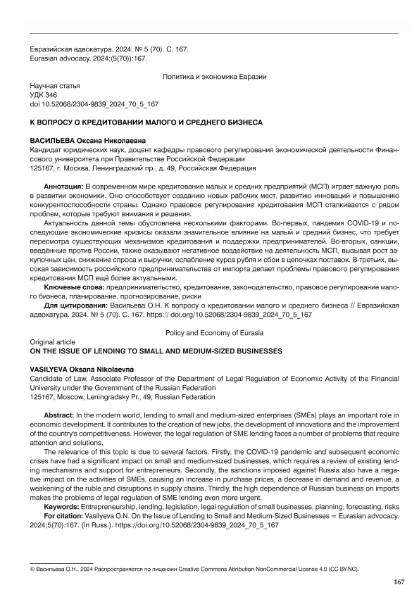 Васильева, О.Н. К вопросу о кредитовании малого и среднего бизнеса // Евразийская адвокатура. – 2024. – № 5. — С. 167-170. — Только в электронном виде. — <URL:http://elib.fa.ru/art2024/bv3591.pdf>.