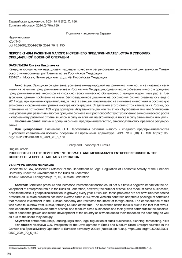 Васильева, О.Н. Перспективы развития малого и среднего предпринимательства в условиях специальной военной операции // Евразийская адвокатура. – 2024. – № 5. — С. 150-155. — Только в электронном виде. — <URL:http://elib.fa.ru/art2024/bv3593.pdf>.