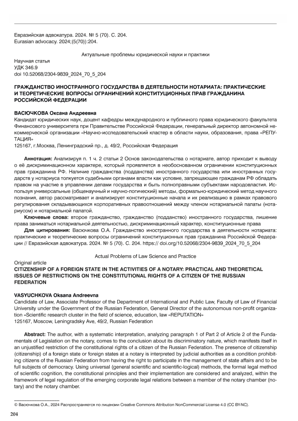 Васючкова, О.А. Гражданство иностранного государства в деятельности нотариата: практические и теоретические вопросы ограничения конституционных прав гражданина Российской Федерации // Евразийская адвокатура. – 2024. – № 5. — С. 204-208. — Только в электронном виде. — <URL:http://elib.fa.ru/art2024/bv3594.pdf>.