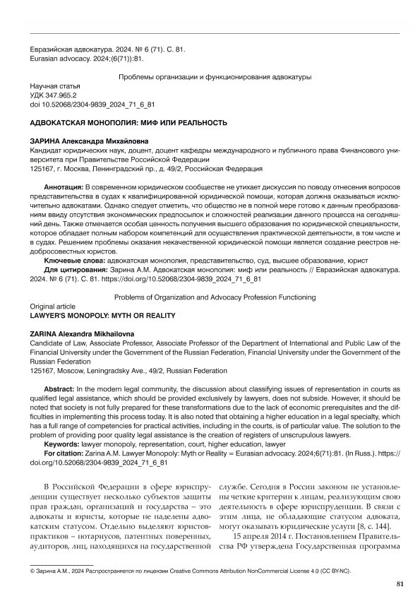 Зарина, А.М. Адвокатская монополия: миф или реальность // Евразийская адвокатура. – 2024. – № 6. — С. 81-84. — Только в электронном виде. — <URL:http://elib.fa.ru/art2024/bv3599.pdf>.
