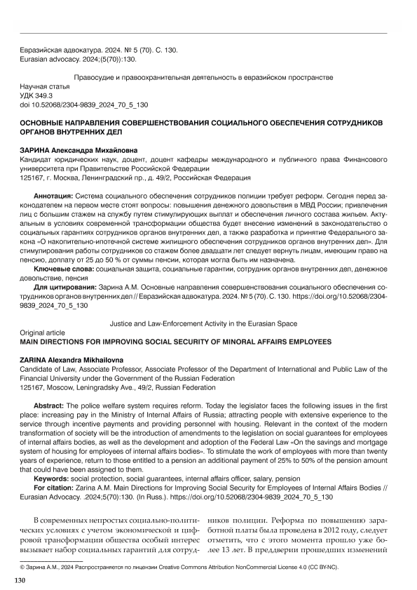 Зарина, А.М. Основные направления совершенствования социального обеспечения сотрудников органов внутренних дел // Евразийская адвокатура. – 2024. – № 5. — С. 130-132. — Только в электронном виде. — <URL:http://elib.fa.ru/art2024/bv3600.pdf>.