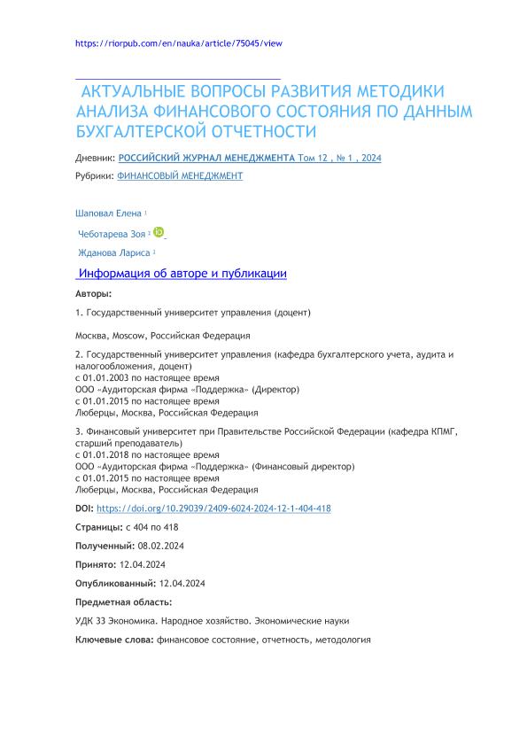 Шаповал, Е. Актуальные вопросы развития методики анализа финансового состояния по данным бухгалтерской отчетности / Е. Шаповал, З. Чеботарева, Л. Жданова. — Текст: электронный // Russian Journal of Management. – 2024. – № 1. — С. 404-418. - URL: https://riorpub.com/en/nauka/article/75045/view. - Дата публикации: 12.04.2024 — <URL:http://elib.fa.ru/art2024/bv3221.pdf>.