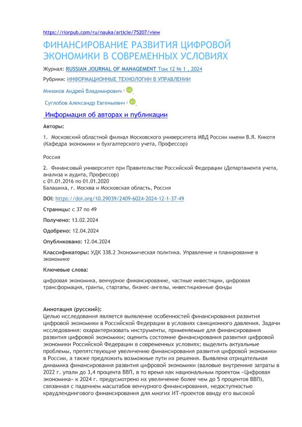 Минаков, А.В. Финансирование развития цифровой экономики в современных условиях / А.В. Минаков, А.Е. Суглобов. — Текст: электронный // Russian Journal of Management. – 2024. – № 1. — С. 37-49. - URL: https://riorpub.com/ru/nauka/article/75207/view. - Дата публикации: 12.04.2024 — <URL:http://elib.fa.ru/art2024/bv3222.pdf>.