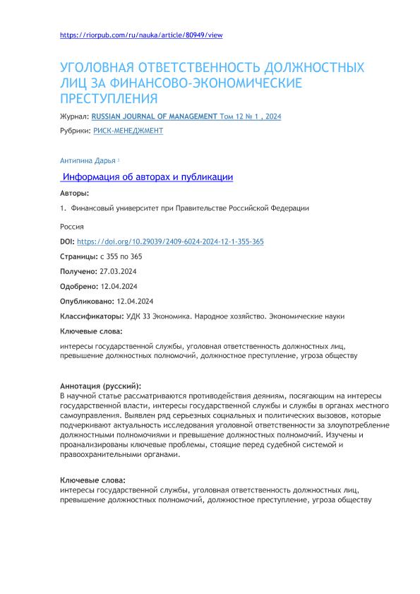 Антипина, Д. Уголовная ответственность должностных лиц за финансово-экономические преступления. — Текст: электронный // Russian Journal of Management. – 2024. – № 1. — С. 355-365. - URL: https://riorpub.com/ru/nauka/article/80949/view. - Дата публикации: 12.04.2024 — <URL:http://elib.fa.ru/art2024/bv3223.pdf>.